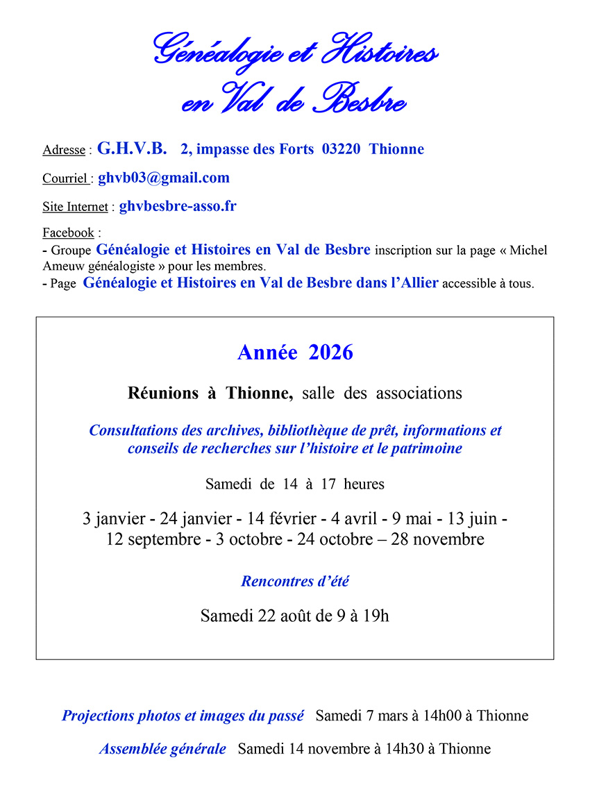 L’association « Généalogie et Histoires en Val de Besbre », créée en 1990, a pour secteur géographique : la Sologne bourbonnaise, le Val de Besbre, les Basses Marches, la Montagne bourbonnaise et les territoires limitrophes dans les départements de la Loire et de la Saône et Loire.